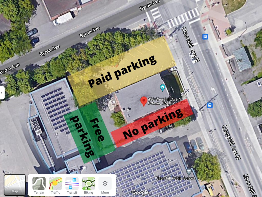 There is plenty of free street parking around Bronson Centre. We recommend Lisgar and Cooper Streets or Primrose Avenue (they are less “shady” than the areas along Nepean Street and Bronson Avenue). There is also a parking lot directly behind the building that can be used during the evening.